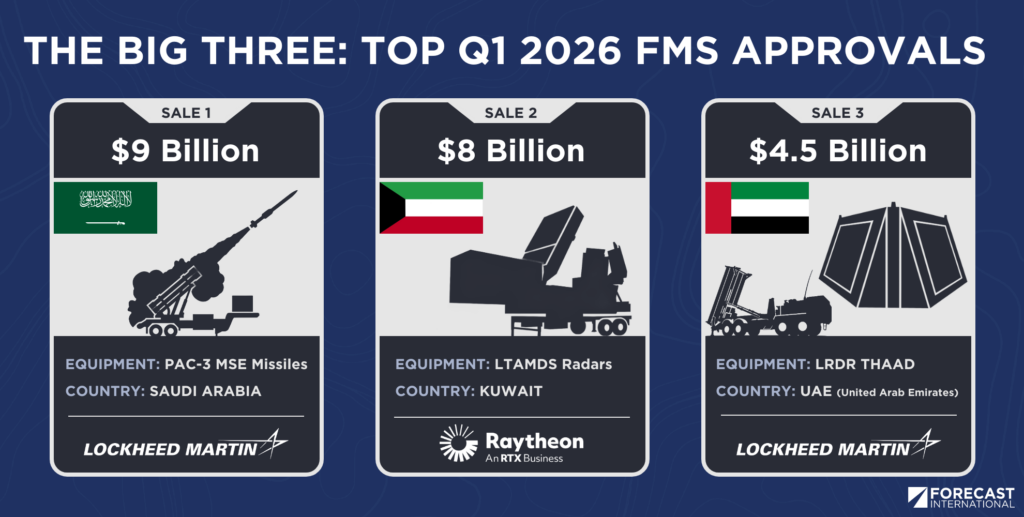 Direct comparisons between first-quarter FMS approvals and the combat systems currently being used by the United States, Israel, and allied Arab states are imperfect. Approved agreements do not automatically translate into deliveries. Follow-on contracts, payments and shipments might not materialize for months or years, if at all. Even so, FMS activity can be a meaningful indicator of geopolitical and industrial trends. This is increasingly true given the scale of combat, stakeholders involved, and weapons consumption driven by the Iranian War.